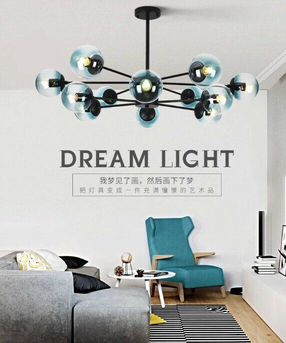 熱推魔豆創意個性分子吊燈(黑色燈體8頭+漸變藍燈罩)