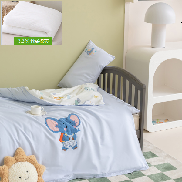 熱推純棉兒童被套+墊套+枕套(藍色上學小象【B類/抗菌/防蟎/0甲醛】)(3.3磅羽絲棉芯六件套)