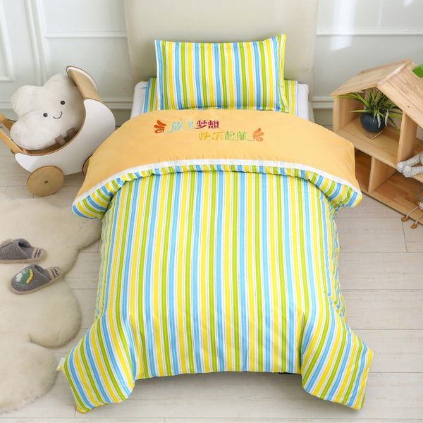 熱推純棉兒童被套+墊套+枕套(黃綠小彩條)(三件套不含芯)