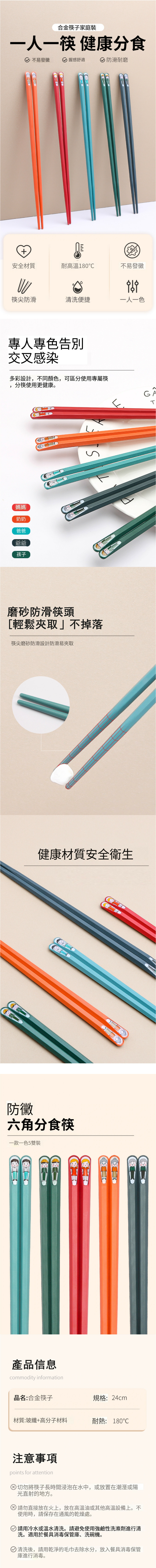 日本SA SAUCE--合金筷子家用高檔防滑防黴【耐高溫筷子】5雙裝(桃太郎)
