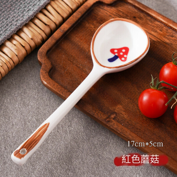 爆款日式長柄圓頭陶瓷勺 湯勺(紅色蘑菇)