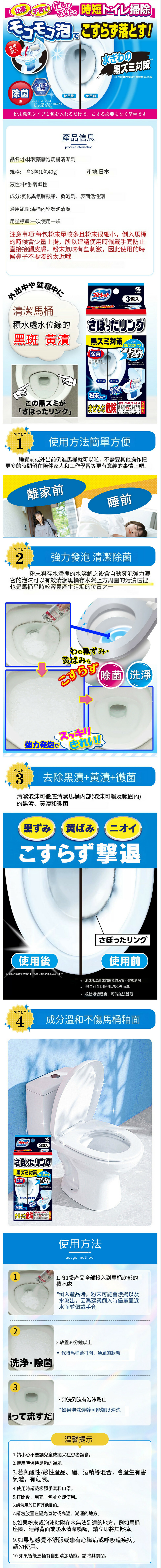 日本小林製藥--强力發泡潔廁劑馬桶洗淨中除垢清潔劑【一盒3包(1包40g)】