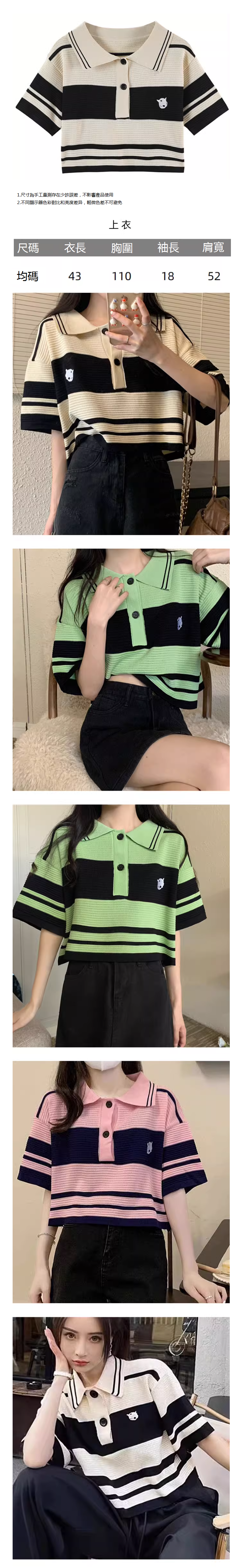 熱賣針織撞色條紋POLO領短袖(杏色)(均碼)