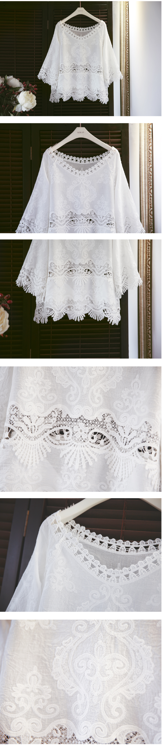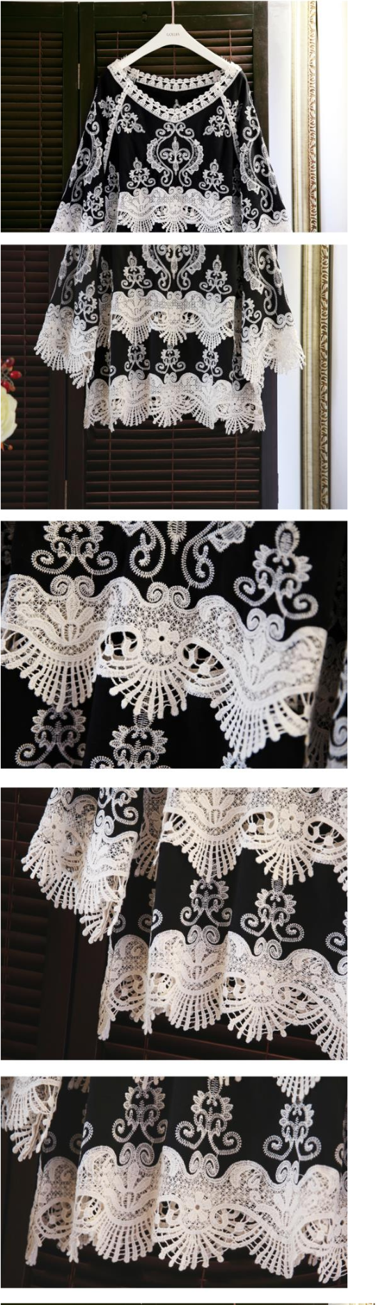 熱推蕾絲刺繡鏤空七分袖V領t恤(黑色)(均碼)