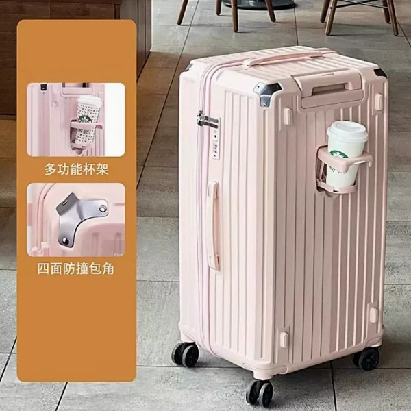 大容量-24吋-行李箱結實耐用拉杆箱密碼箱(粉色)【拉鍊款+杯架款】