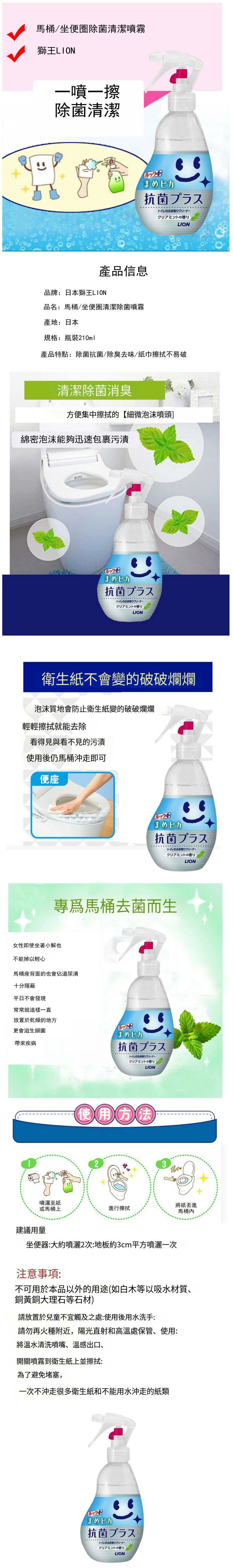 LION/獅王--馬桶坐便圈蓋清潔劑【免洗泡沫噴霧】薄荷抗菌210mlx1瓶裝
