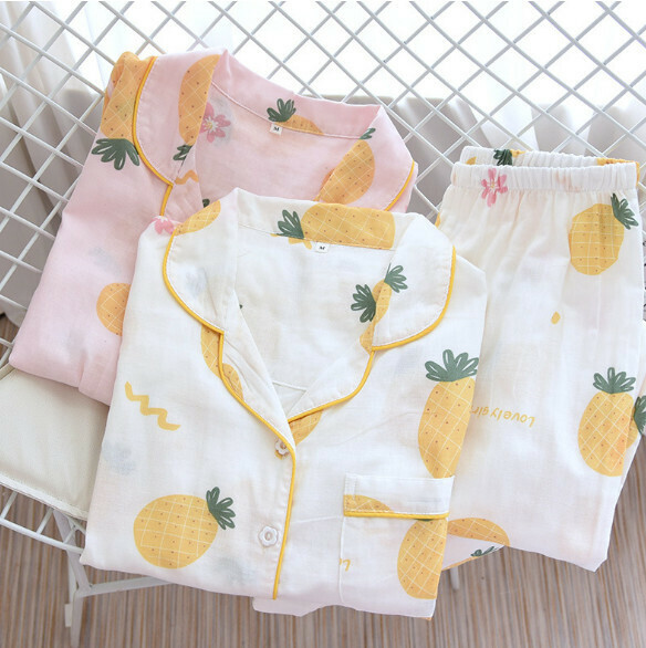 熱賣長袖棉紗布睡衣(ZHY白底小鳳梨)【M-XL碼】【下單後聯絡客服確認發貨尺碼】