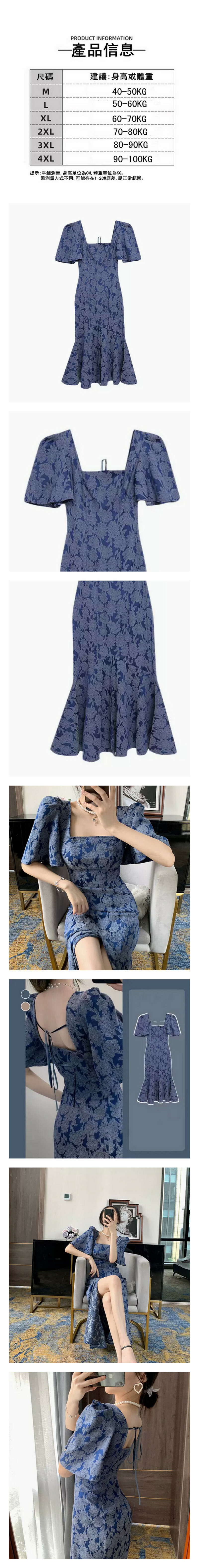 激抵魚尾方領碎花連衣裙#單件(藍色)(M-4XL碼) (下單後聯系客服確認尺碼)