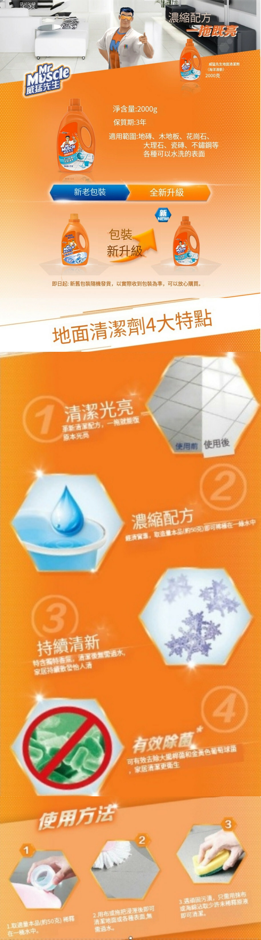 威猛先生地面清潔劑洗瓷地磚除菌去污垢木地板拖地液【海洋清新2kg*1瓶裝】(包裝升級 新舊包裝隨機發貨)
