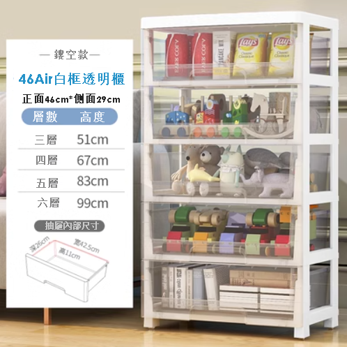 新款【5層】46面寬 玩具收納箱盒抽屜式家用儲物箱(鏤空款 白框架)