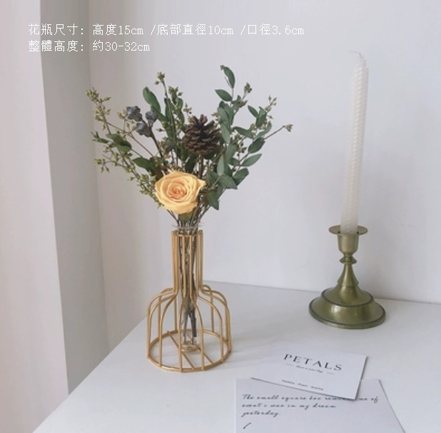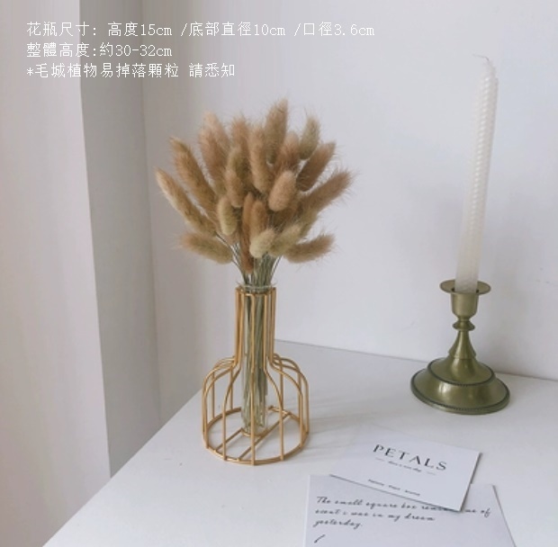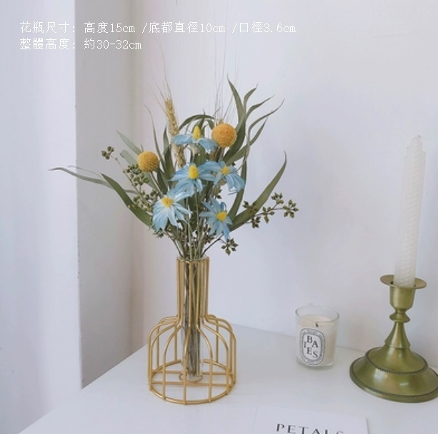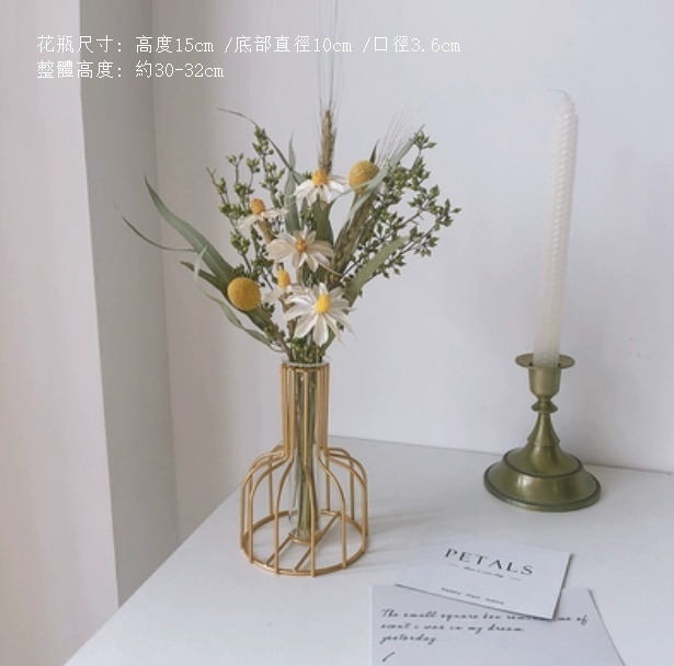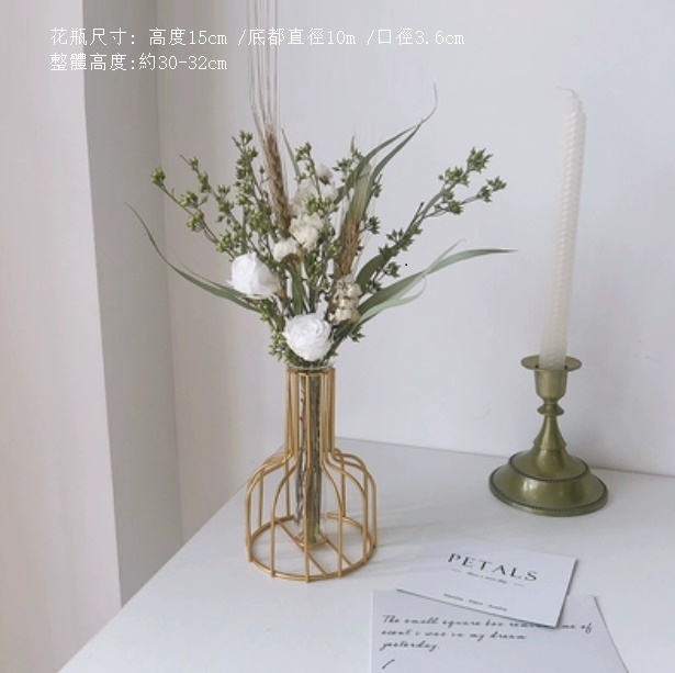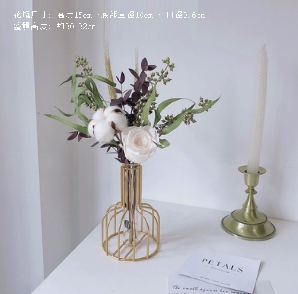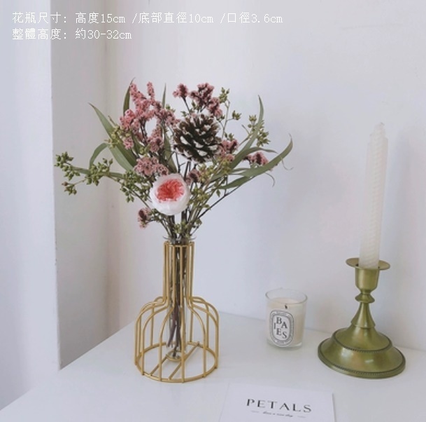 新款風幹花裝飾擺件(金色鐵藝花瓶 蜜桃尤加利)