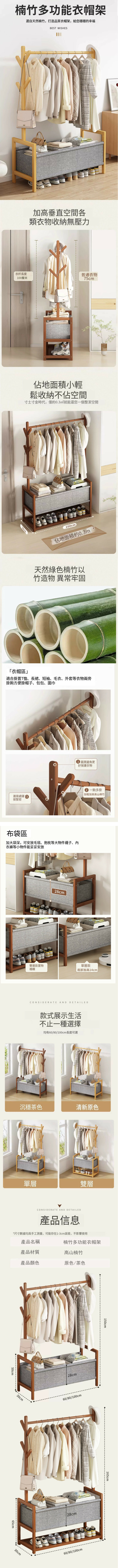 新款楠竹實木家具 衣櫃 衣帽架 曬衣架 【100x30x165cm】雙層 茶色