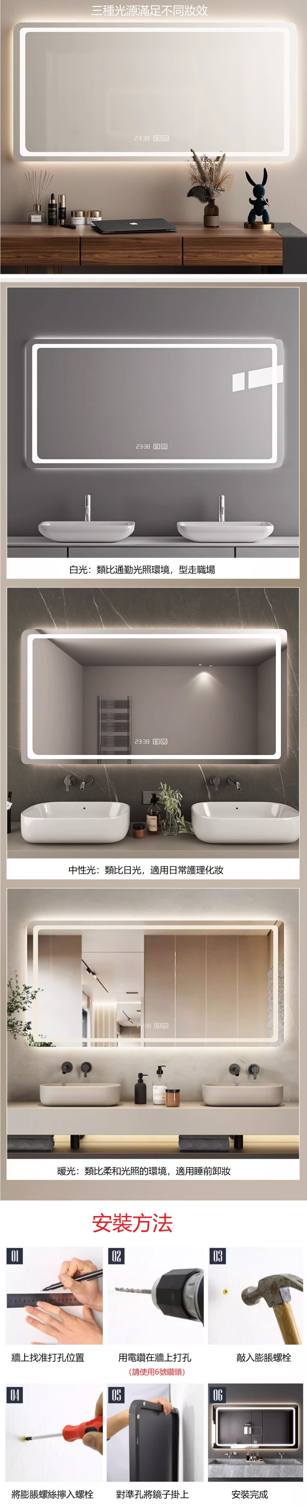 新款浴室掛牆LED觸摸屏貼牆發光浴室鏡【尊享款】【雙觸摸+除霧+防爆+時間溫度50*70cm】