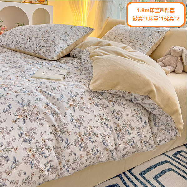 新款床上用品四件套(花香暖語【100%純棉+高密牛奶絨】)(尺寸1.8m床笠四件套)