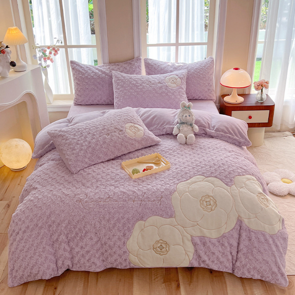 新款床上用品獺兔絨四件套(山茶-黛紫)(尺寸1.5m床單款)