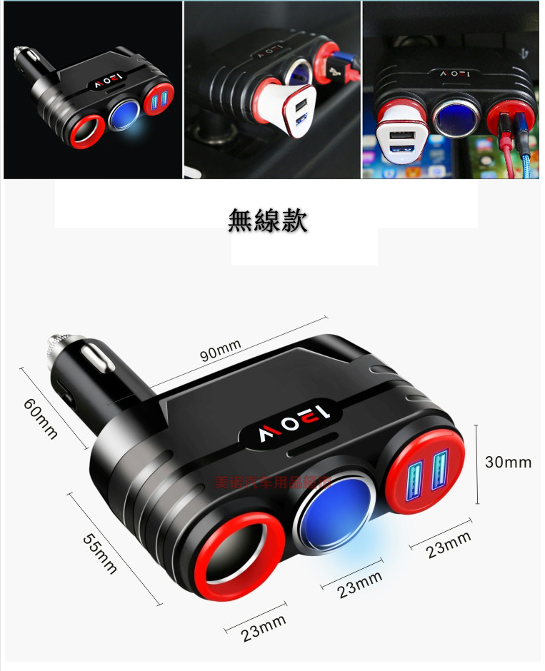 新款汽車多功能一拖三充電器(無線紅環)