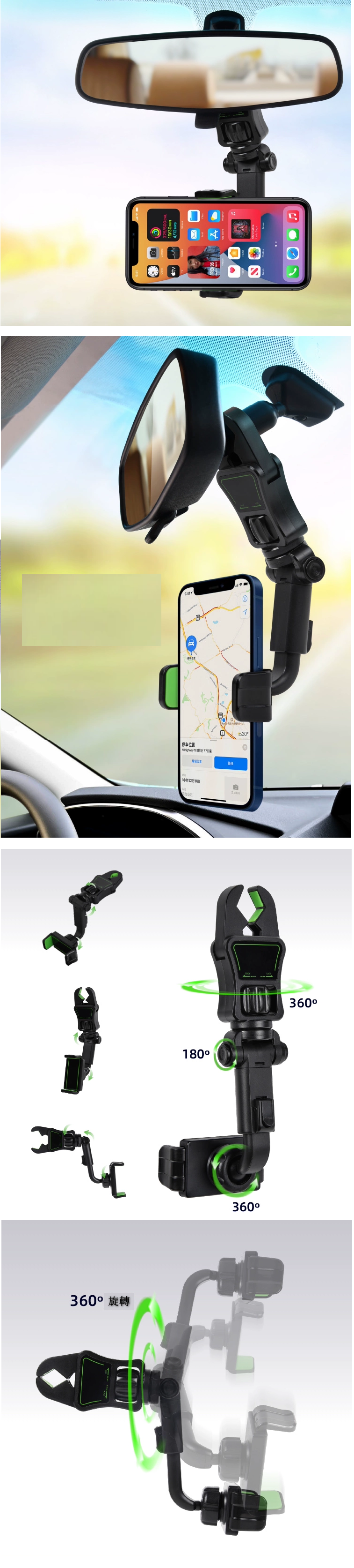新款汽車後視鏡防震360度無死角旋轉手機支架(黑色)