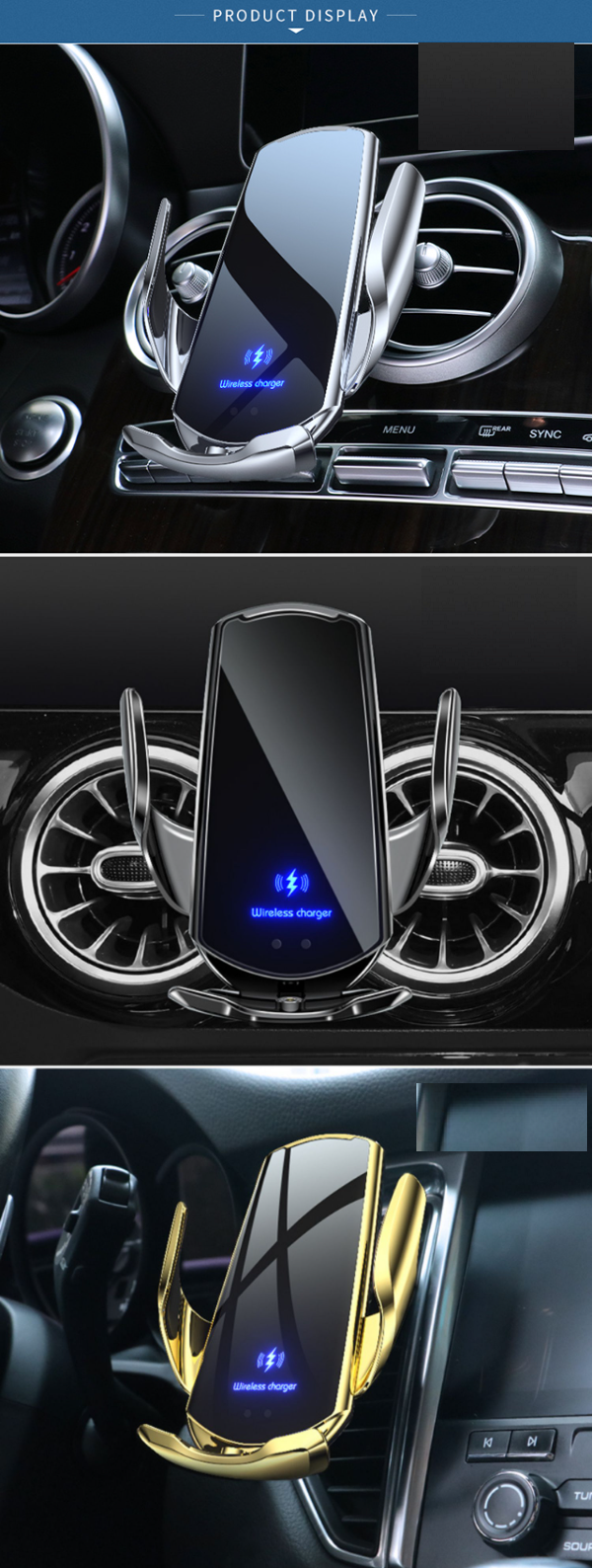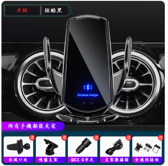新款車載無線充電器(標配炫酷黑+數據線+出風口夾+底座吸盤+數顯快充頭+三個接頭)