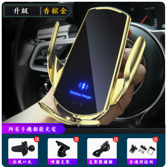 新款車載無線充電器(升級兩用款香槟金+數據線+出風口夾+底座吸盤+三個接頭)