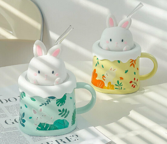 新款陶瓷水杯【301-400ml】【黃色(兔子蓋+吸管)】
