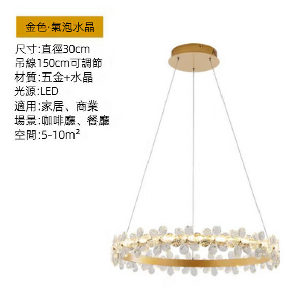 新款水晶花圓環吊燈(金色30cm單層-三色變光)