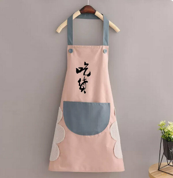 新款時尚防油圍裙-擦手防水掛脖粉配藍書法吃貨