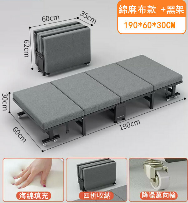 新款鐵藝傢具 摺疊床 兒童床 休閑床 【棉麻布+海棉款+黑架】60x190cm