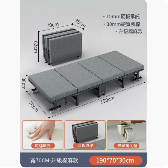 新款鐵藝傢具 摺疊床 兒童床 休閑床 【棉麻布+海棉款+黑架】70x190cm
