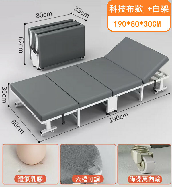 新款鐵藝傢具 摺疊床 兒童床 休閑床 【科技布+乳膠款+白架+頭部可調高度】80x190cm