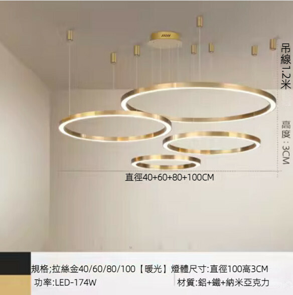 新款輕奢led圈圈吊燈(拉絲金單式四層100+80+60+40暖光)