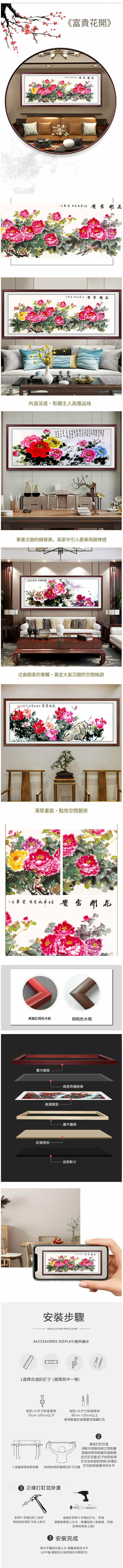 新款客廳裝飾畫掛畫(帶框尺寸:228*88cm 花開富貴-3 複刻噴繪+紅褐色實木框)