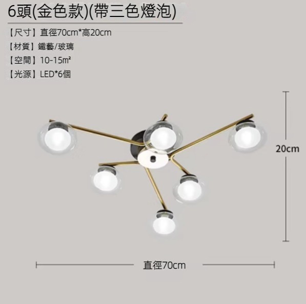 新款魔豆吸頂燈(6頭金色玻璃燈罩/三色光)