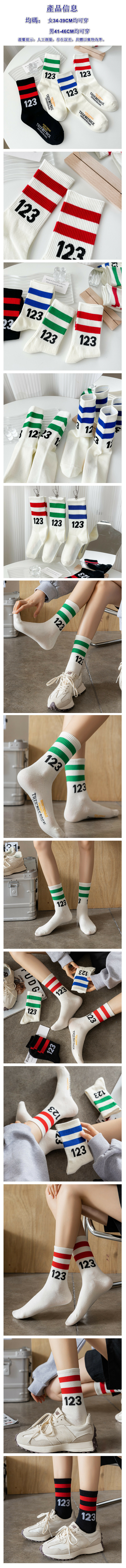 新款男女同款數字運動雙槓條紋中筒襪 學院風棉襪【白色綠條】【均碼】