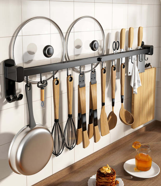 新款廚房用品多功能置物掛架(黑色60cm10鉤可放鍋蓋)(尺寸:60*10*4.5CM)