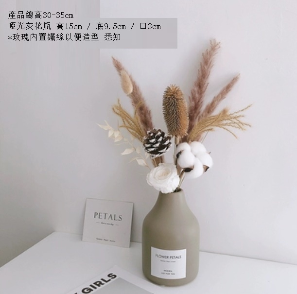 新款天然手工花桌面擺件(啞光灰色花瓶 玫瑰蓮蓬小蘆葦)