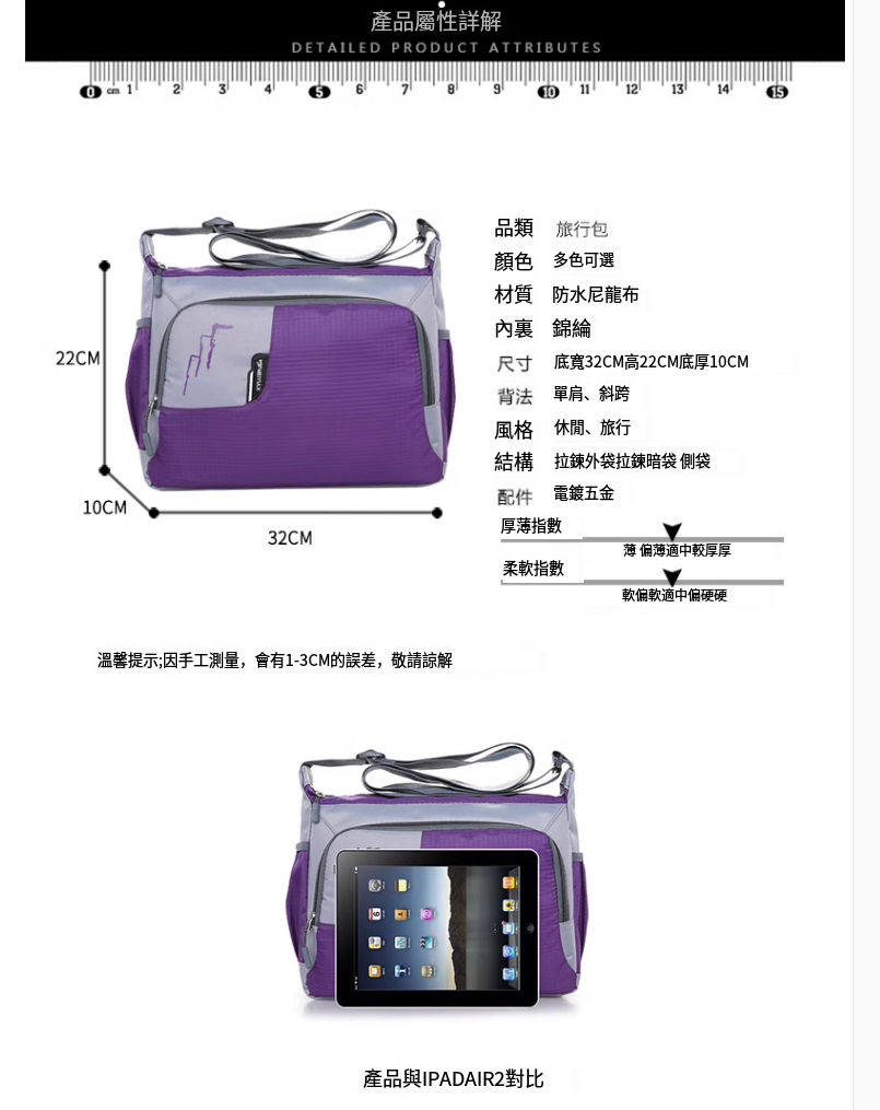 新款戶外休閒 運動女包 牛津布斜跨包 旅遊單肩斜挎包 防水尼龍布包【紫色】