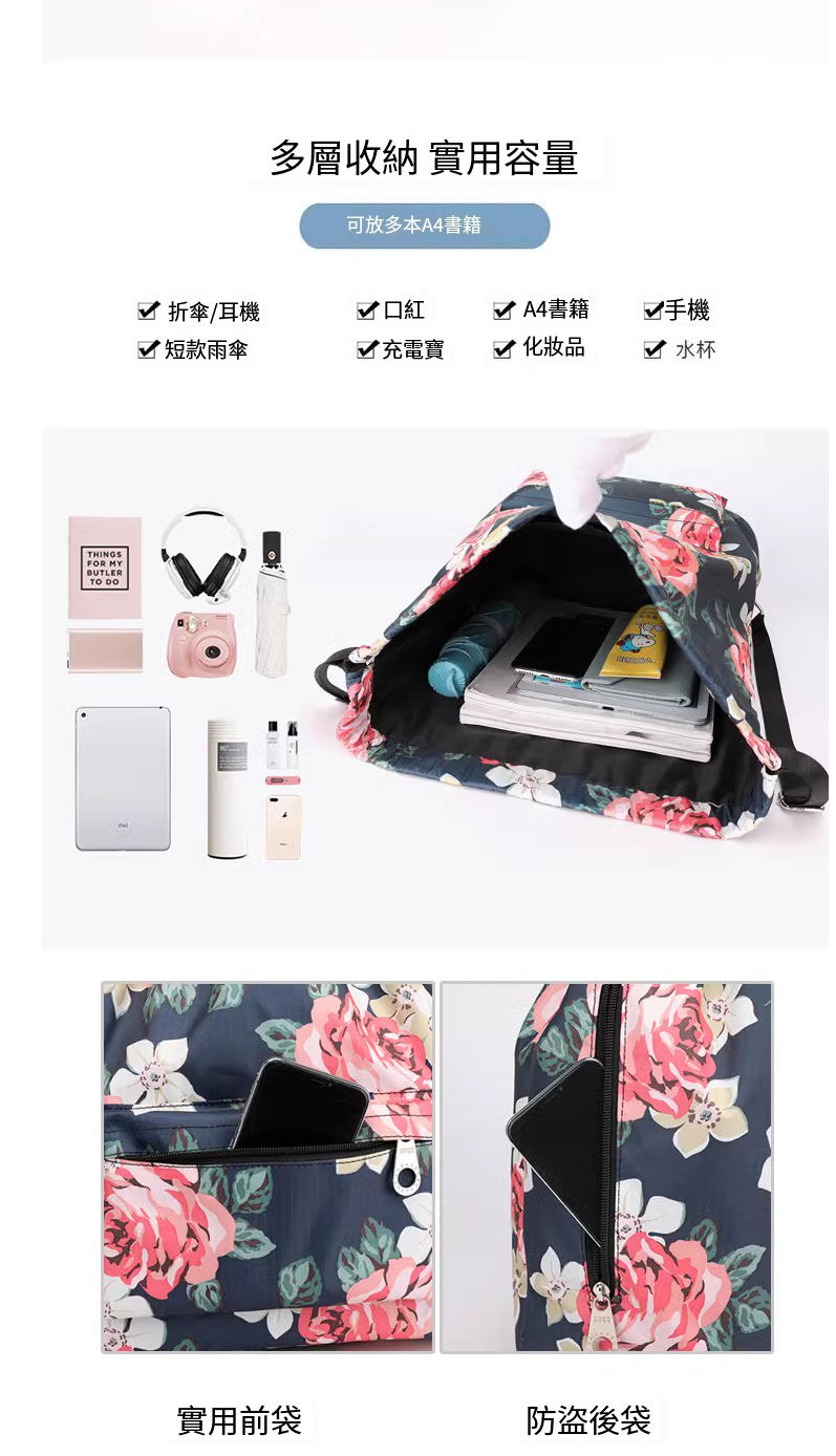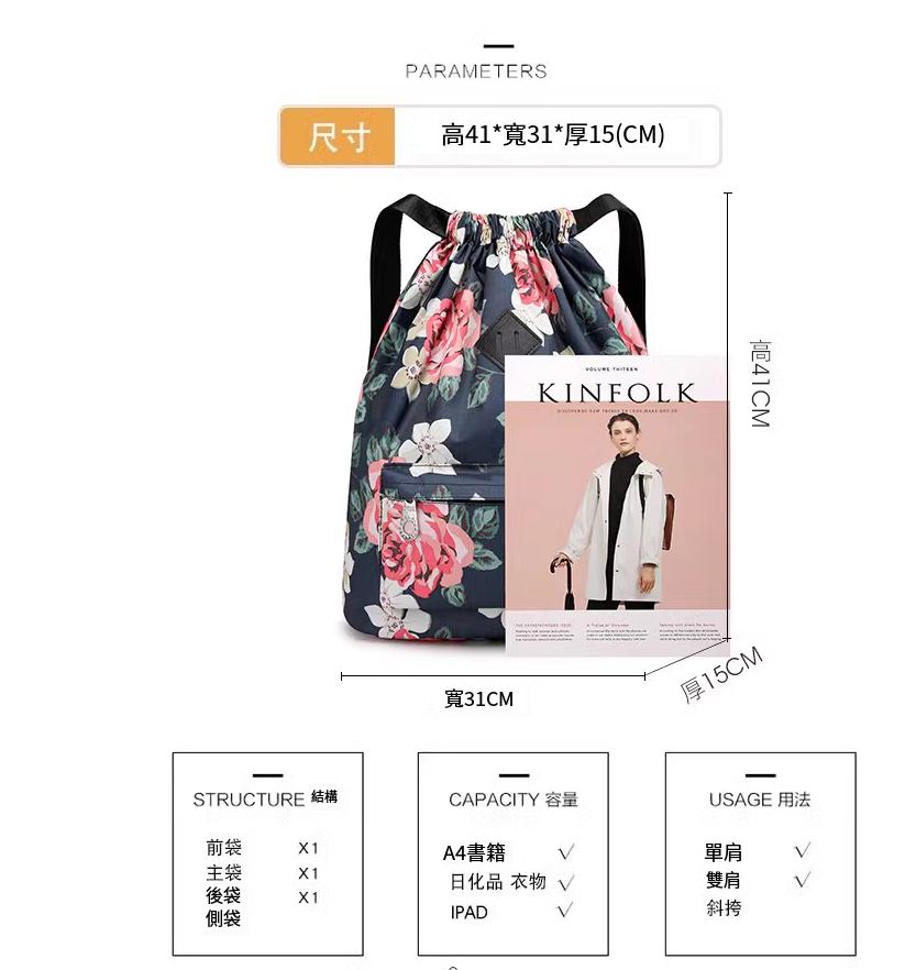 新款牛津布抽繩束口袋 雙肩包女 輕便尼龍運動旅行大容量旅行包【黑色】