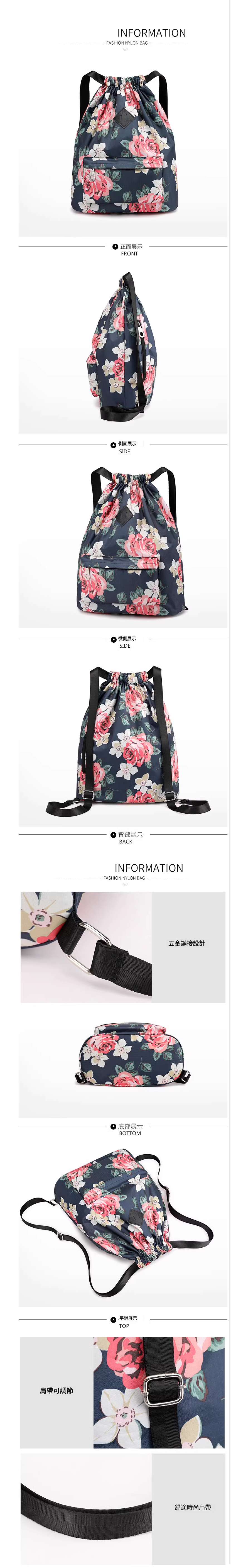 新款牛津布抽繩束口袋 雙肩包女 輕便尼龍運動旅行大容量旅行包【油墨花】