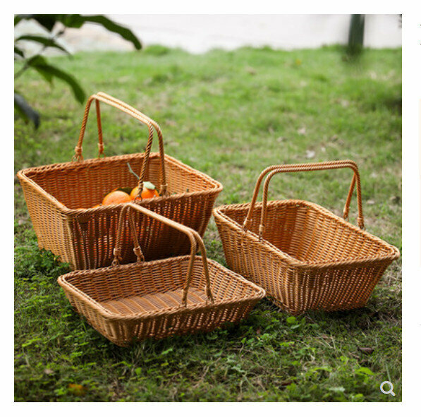 新款塑料籐編收納筐帶蓋野餐籃(方形中號/無蓋)尺寸:34*27*14CM)