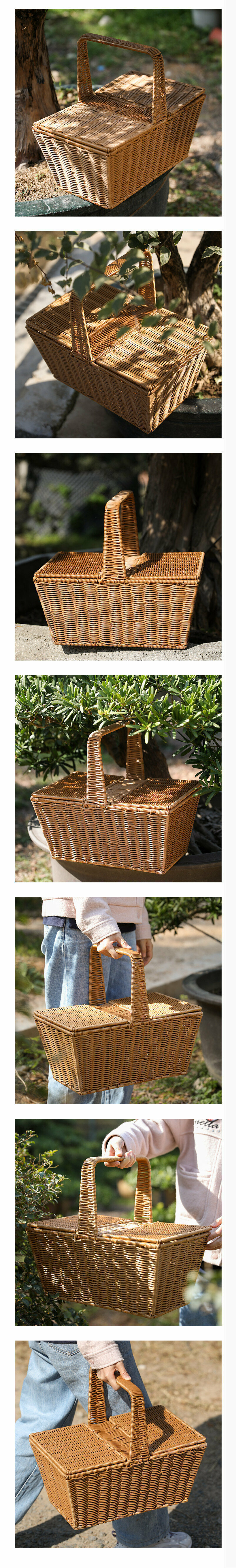 新款塑料籐編收納筐帶蓋野餐籃(淺咖色/升級框架款)尺寸:35*25*19/36CM)