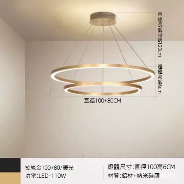 新款圓形圈圈吊燈(拉絲金單式雙層100 +80/暖光)