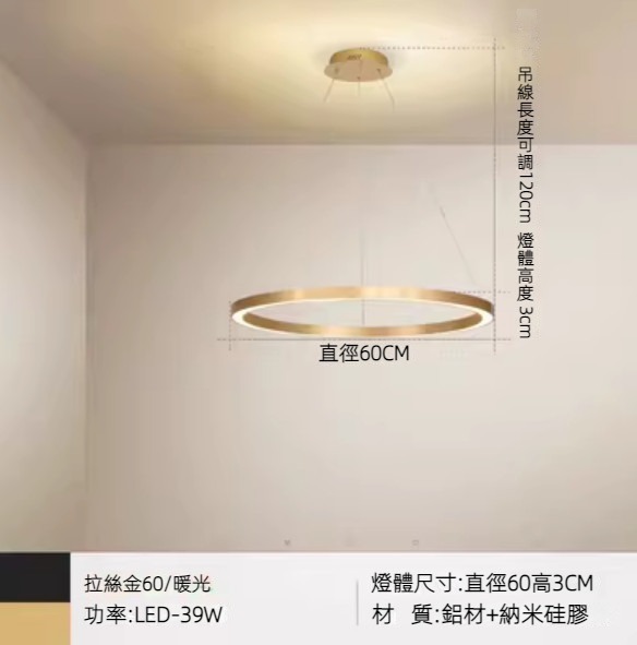 新款圓形圈圈吊燈(拉絲金單式單層60/暖光)