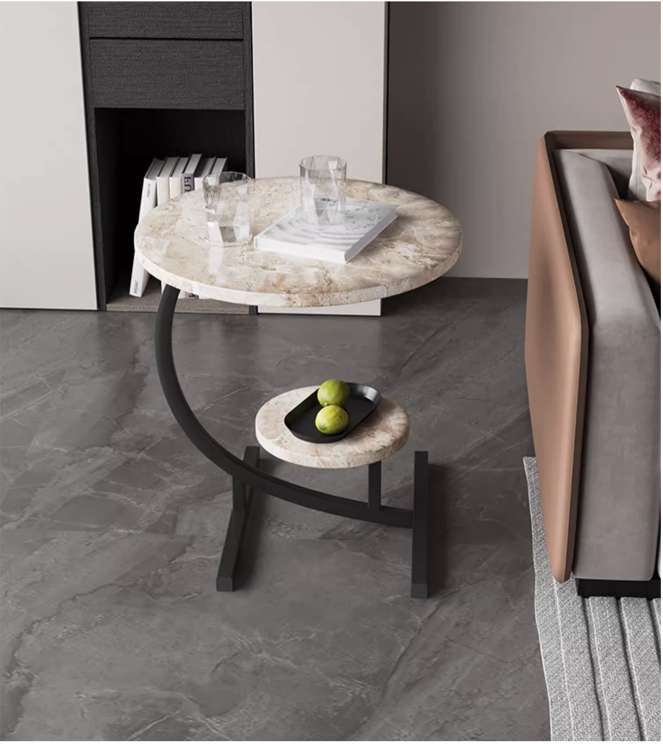 新款簡約雙層迷你小圓桌(金架+白石紋)(尺寸:60*45*30*32CM)