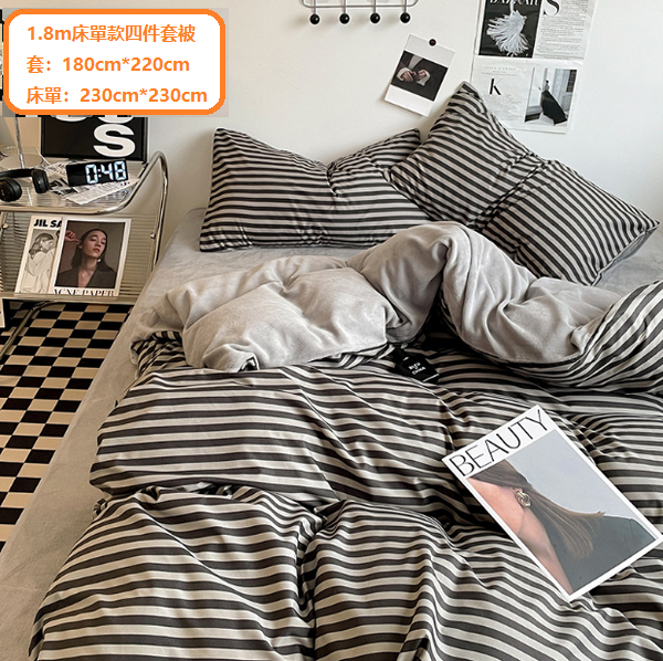 新款條紋牛奶絨床上用品(暖絨-炭黑條)(1.8m床單款四件套【被套:180cm*220cm,床單:230cm*230cm】)