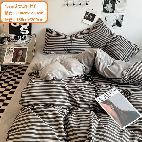 新款條紋牛奶絨床上用品(暖絨-炭黑條)(1.8m床笠款四件套【被套:200cm*230cm,床笠:180cm*200cm】)