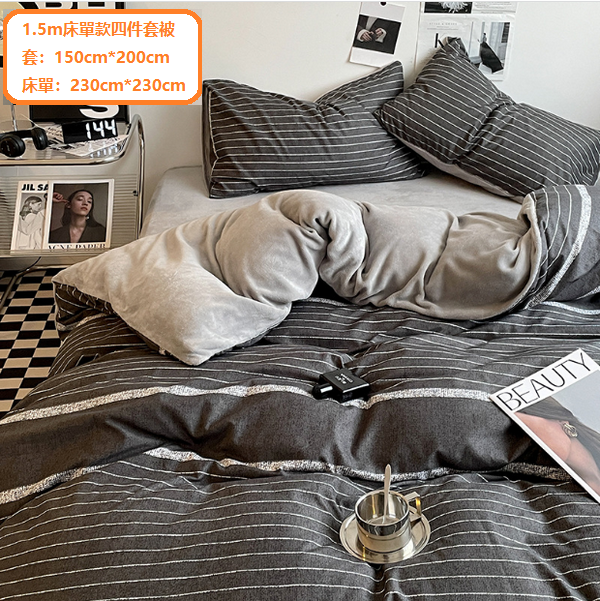 新款條紋牛奶絨床上用品(暖絨-深灰條)(1.5m床單款四件套【被套:150cm*200cm,床單:230cm*230cm】)