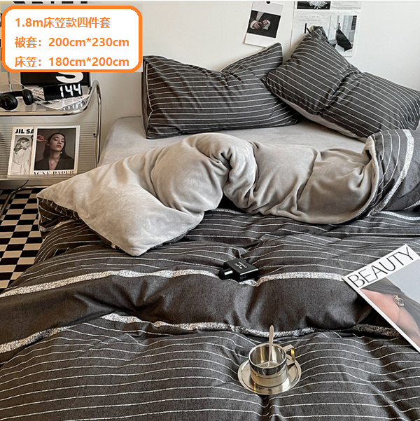 新款條紋牛奶絨床上用品(暖絨-深灰條)(1.8m床笠款四件套【被套:200cm*230cm,床笠:180cm*200cm】)