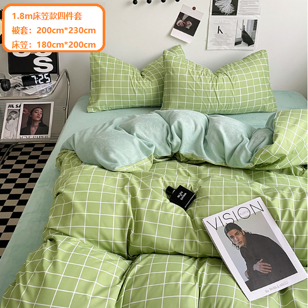 新款條紋牛奶絨床上用品(暖絨-淺綠格)(1.8m床笠款四件套【被套:200cm*230cm,床笠:180cm*200cm】)
