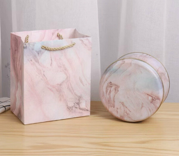 新款【10個】可愛圓形精緻盒子-大理石-小號套裝<小號盒子13.5*7cm【5.5寸】+手提袋>