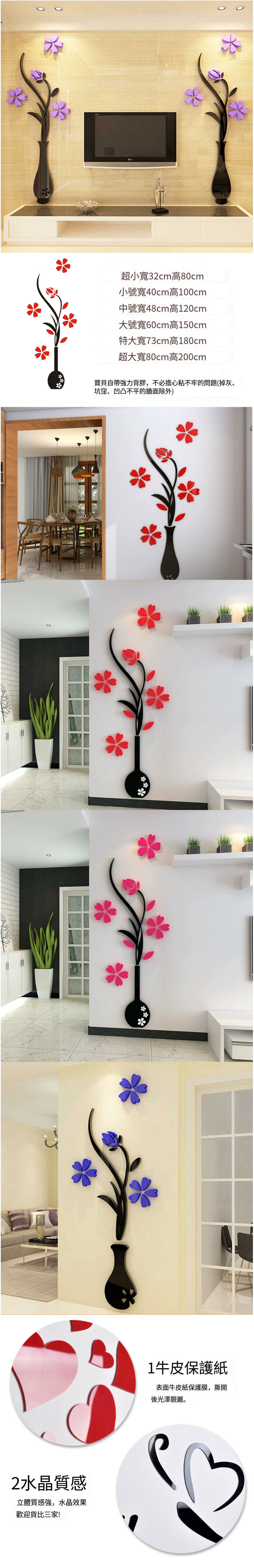 新款花瓶亞克力3d立體牆貼【黑瓶+玫紅花 款7】尺寸【大】